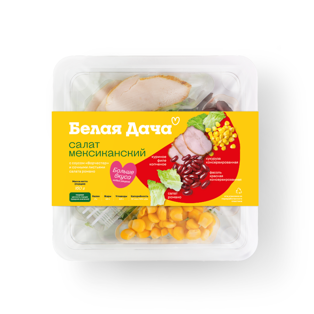 салат романо, куриное филе копченое, консерв. кукуруза, фасоль, салат фриссе, салат радиччо, заправка из лимона, масла и соуса ворчестер